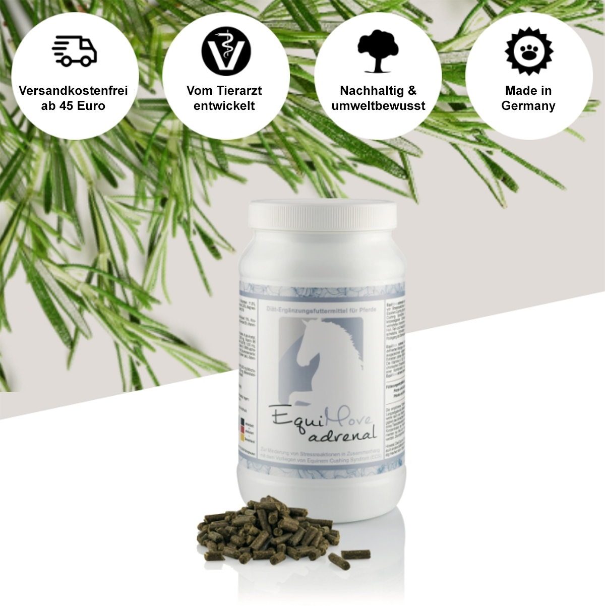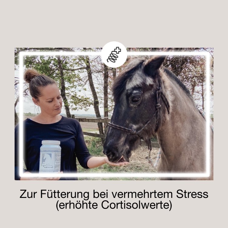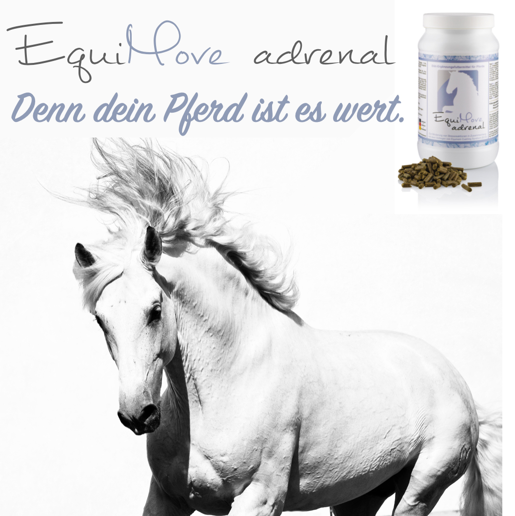 EquiMove adrenal wurde als Diät-Ergänzungsfuttermittel zur Minderung von Stressreaktionen konzipiert, welche typisch beim Vorliegen des Equinen Cushing Syndroms (ECS bzw. PPID) sind. Das Krankheitsbild des Equinen Cushing Syndroms beschreibt eine vermehrte Freisetzung des körpereigenen Cortisols. Cortisol gilt als das Stress-Hormon; ein vermehrtes Vorkommen im Körper führt zu typischen Symptomen mit Huf-, Fell- und Hautprobleme, vermehrter Wasseraufnahme, Leistungsschwäche, Schwitzen, Anbildung eines Hängebauchs sowie einem Rückgang der Bemuskelung.