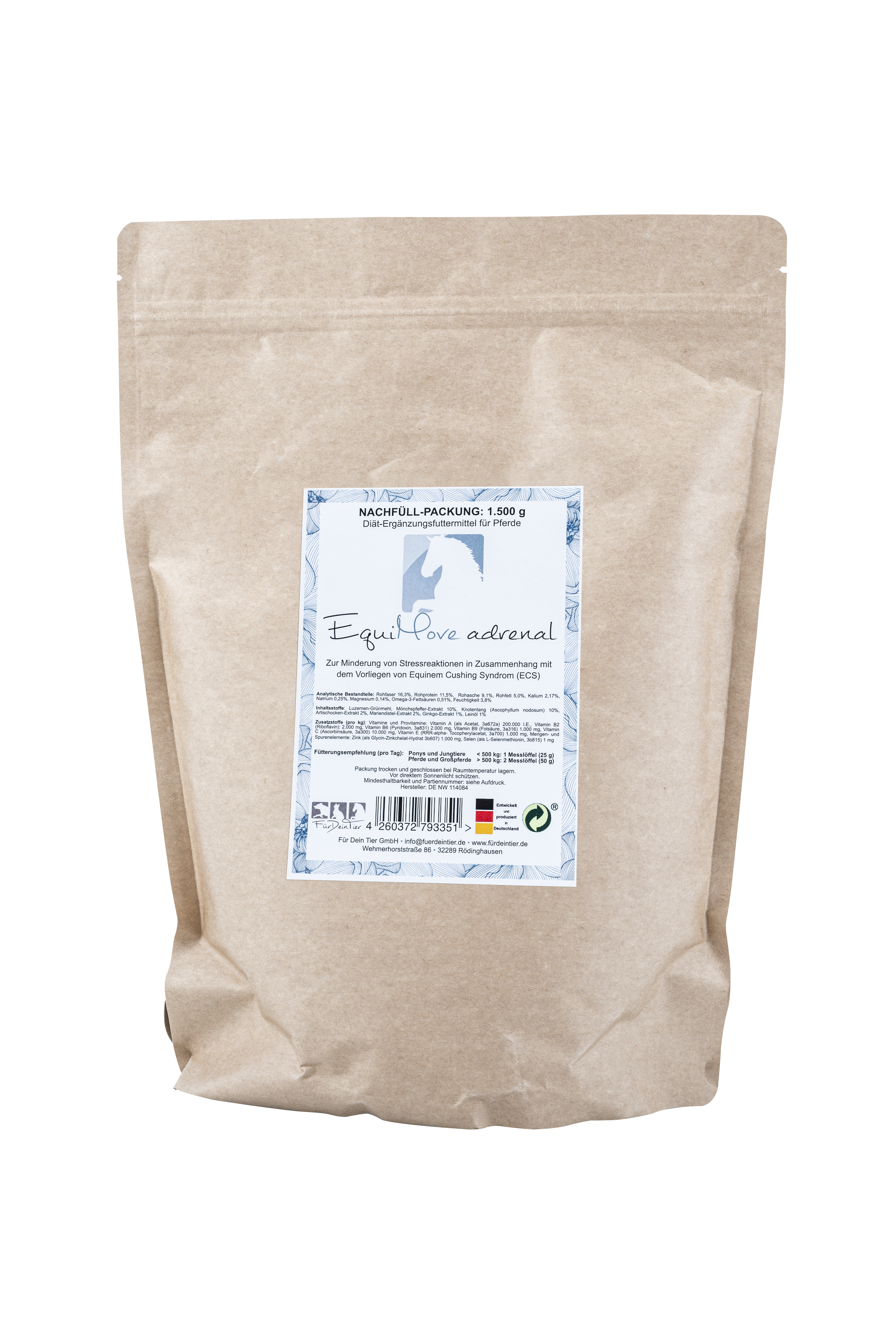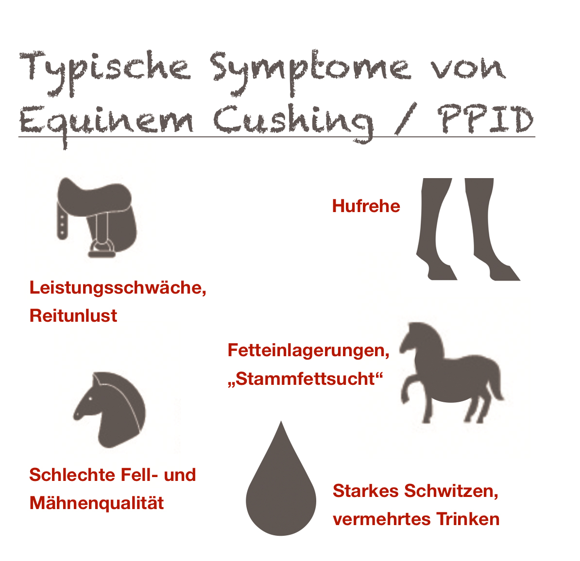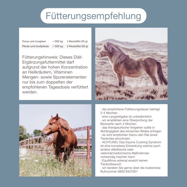 ACHTUNG: Das Equine Cushing Syndrom ist eine komplexe Erkrankung welche auch andere diätetische oder veterinärmedizinische Maßnahmen notwendig machen kann. EquiMove adrenal ersetzt keinen Tierarztbesuch.
