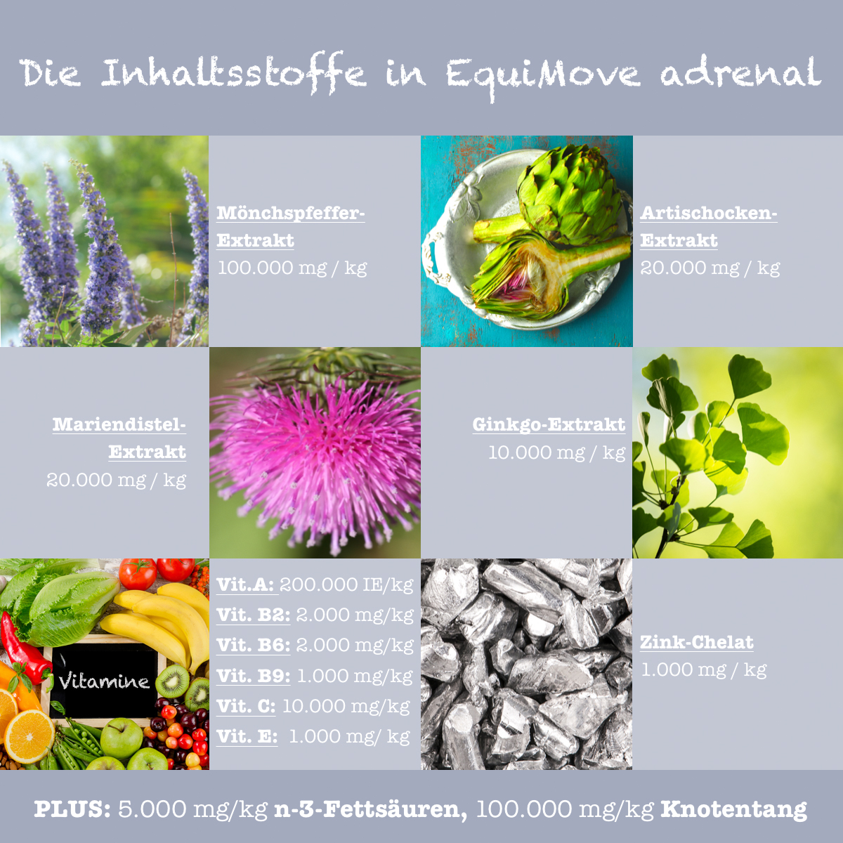 Eine Tagesportion EquiMove adrenal enthält 5.000 mg Mönchspfeffer-Extrakt, 1.000 mg Artischocken-Extrakt, 1.000 mg Mariendistel-Extrakt (800 mg Silymarin) sowie 500 mg Ginkgo-Extrakt.