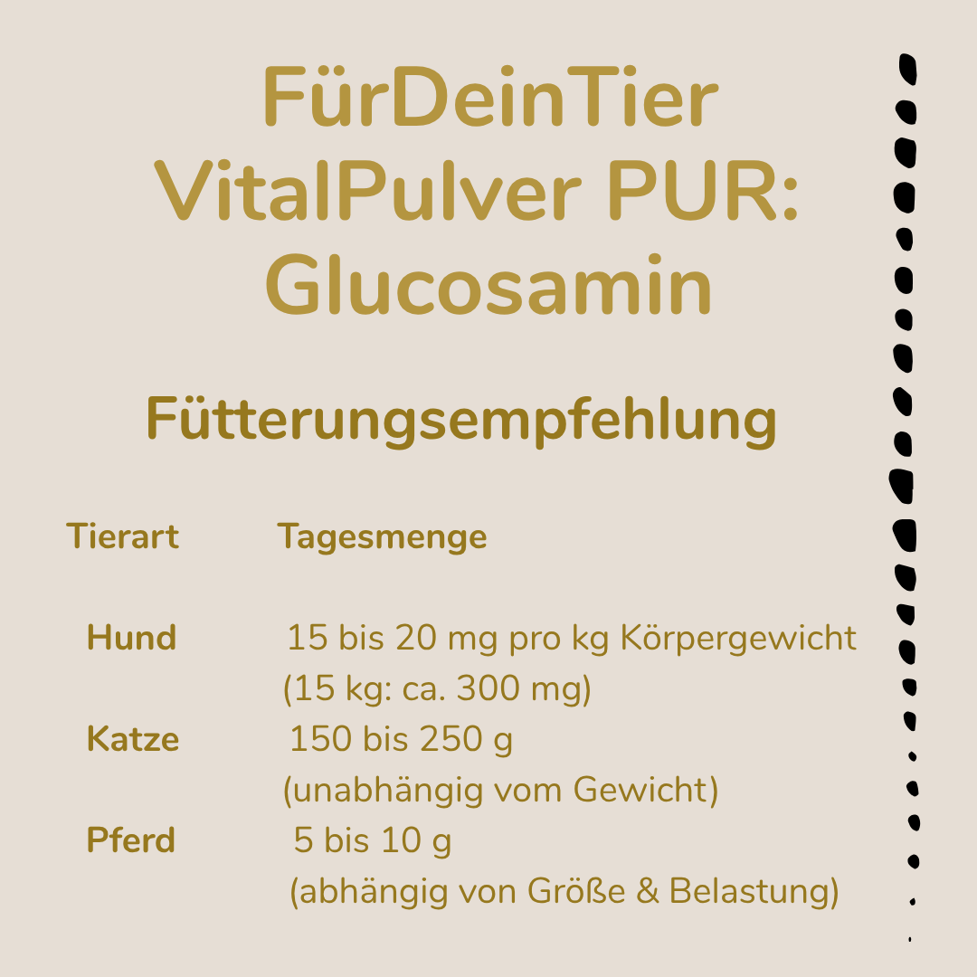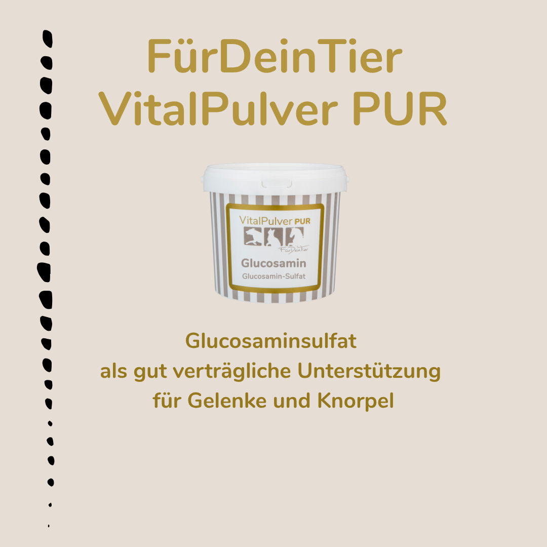 Mit zunehmendem Alter, bei hoher körperlicher Belastung oder durch besondere Lebensumstände kann der natürliche Glucosamin-Stoffwechsel eingeschränkt sein. Eine Ergänzung über die tägliche Fütterung kann daher sinnvoll sein.